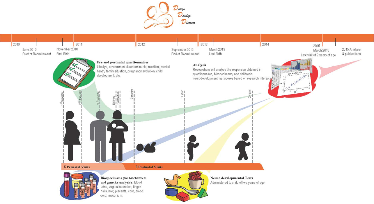 In order to achieve these goals, the 3D study created a cohort (mother-father-child) which included follow up until the child had achieved two years of age. Data and biological material (samples) has been collected from participants of this cohort in order to create a data bank as well as a biological specimens bank (also referred to as biobank). This information will serve the 3D study as well as several ancillary studies that will join in as the project develops.