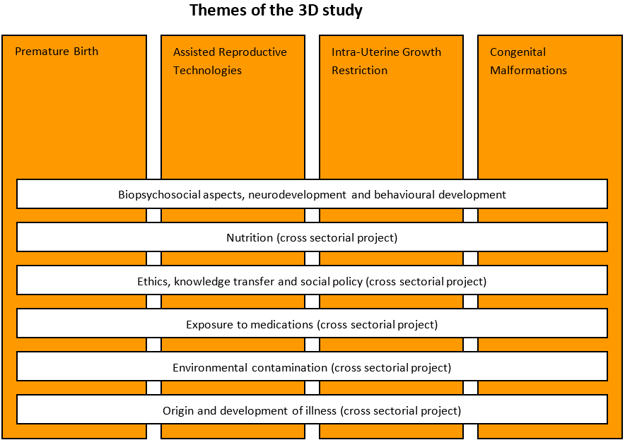 The 3D study is particularly interested in four main themes in perinatal research and also includes interdisciplinary projects.