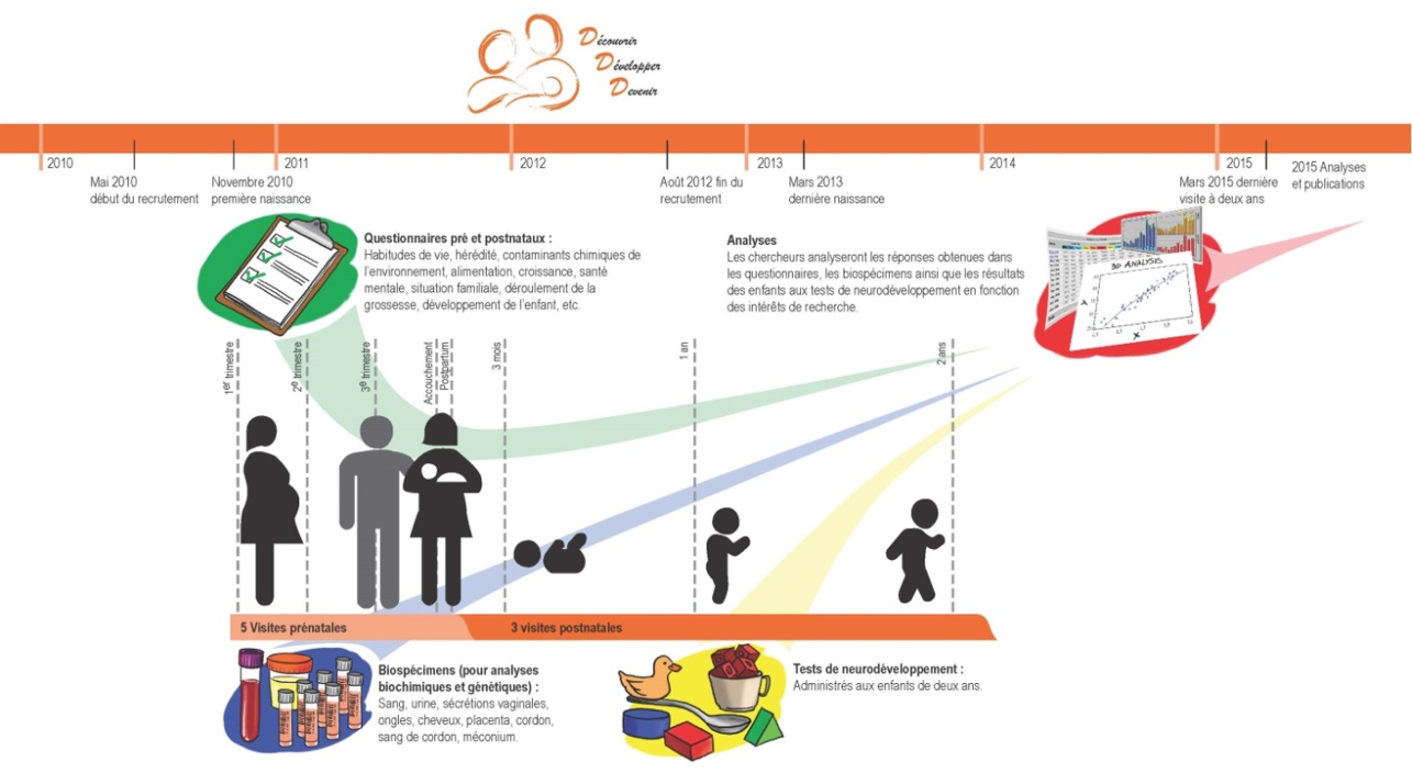 Afin d’atteindre ces objectifs, l’étude 3D a constitué une cohorte (mère-père-enfant) et en a assuré le suivi jusqu’à l’âge de deux ans des enfants. Des données et du matériel biologique (échantillons) sont recueillis de cette cohorte afin de constituer une banque de données ainsi qu’une banque de matériel biologique (aussi appelée biobanque). Ces informations serviront à alimenter les études prévues par l’étude 3D ainsi que les études affiliées qui viendront se greffer au fil du temps.