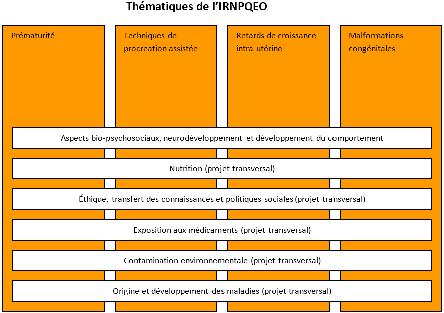 L’étude 3D s’intéresse particulièrement à quatre grands thèmes de recherche en périnatalité ainsi qu’à des projets transversaux.
